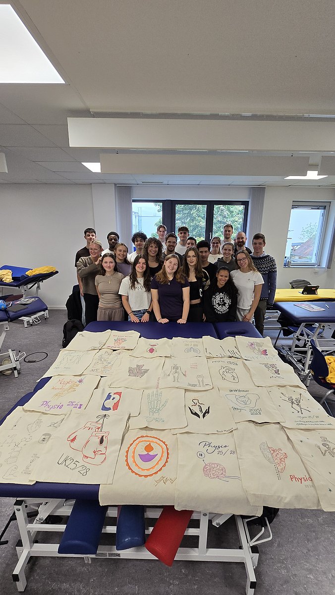 Am 1. Oktober 2025 wurden 26 Schülerinnen und Schüler des neuen Unterkurses an der Berufsfachschule für Physiotherapie am BSZG Erlangen herzlich von der Schulleitung und dem Lehrerteam begrüßt. Der Mittelkurs (2. Ausbildungsjahr) empfing die neuen Mitschülerinnen und Mitschüler mit einem großzügigen Buffet und selbst bemalten Taschen, die mit notwendigen Arbeitsmitteln bestückt wurden und übernahmen als Paten die erste Begleitung durch den Schulalltag. Voller Erwartung starteten die neuen Auszubildenden nun in ihre ersten physiotherapeutischen Lerninhalte.